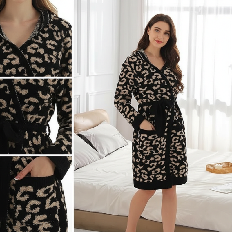 A wrap-style closure combined with an adjustable belt allows the robe to adapt easily to different fit preferences. The hooded design adds functional coverage, while front pockets provide convenient storage for small household items. The leopard pattern adds visual texture without affecting the robe’s practical structure.