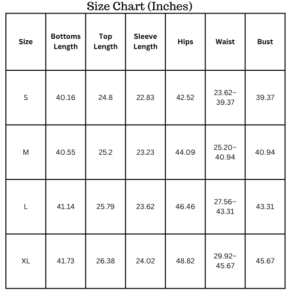 - Bottom Style: Full length matching pants