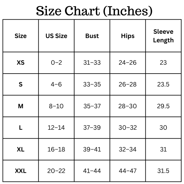 Size Chart (inches):-