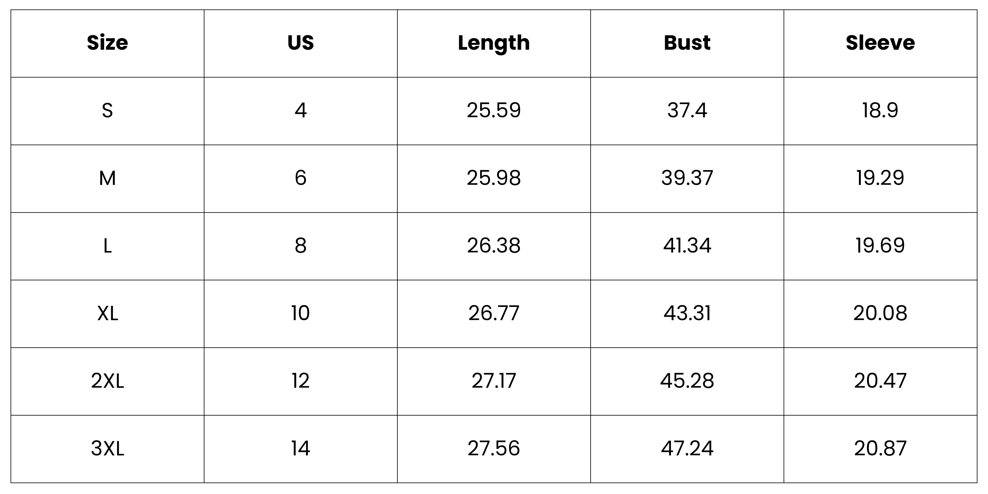 Size Chart (inches):